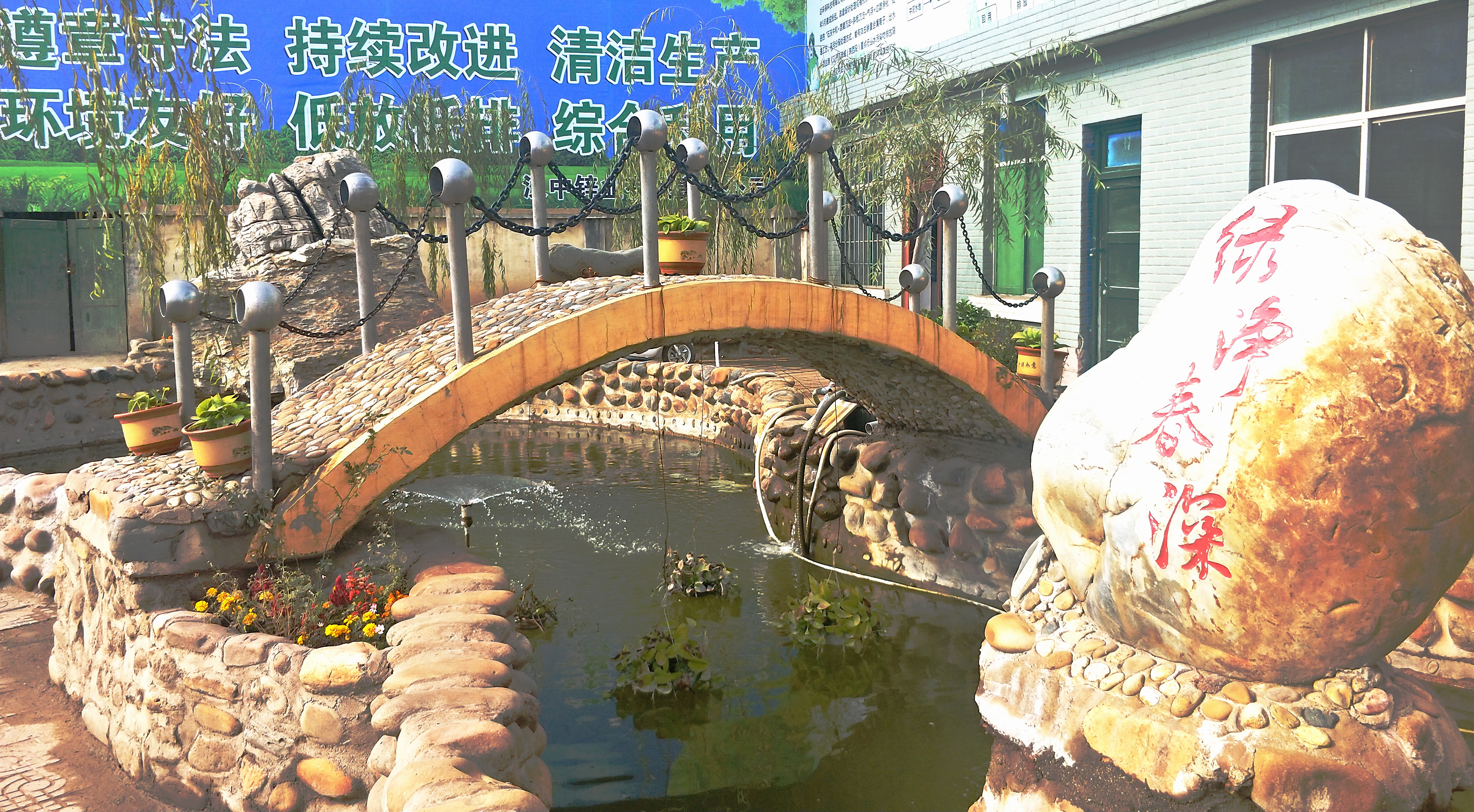 最吸引眼球的莫過于車間辦公室前面的小花池了!形色各異的石頭砌就的圍堰獨具特色,碧綠的池水上架著一座微型拱橋,廢舊物料制作的銀白色立柱、圓球形套環(huán)與黑褐色鐵鏈組成的安全護欄,一下子把小橋裝扮得韻味十足。兩塊形態(tài)獨特的文化石屹立在池水中,一塊寫著“清風(fēng)池”,另一塊寫著“綠凈春深”;水面上的噴頭如一朵小蓮花正吐露著銀色的水花;難得的暖陽灑向水面,紅色、黃色、銀白色的小金魚聞聲成群結(jié)隊地向我們游來,不時激起一圈圈漣漪。“清風(fēng)池”上微風(fēng)徐來,“綠凈春深”意境悠遠,怎一個美字了得?不由得讓人駐足觀望,仿佛自己走進了鬧市中公園一角。