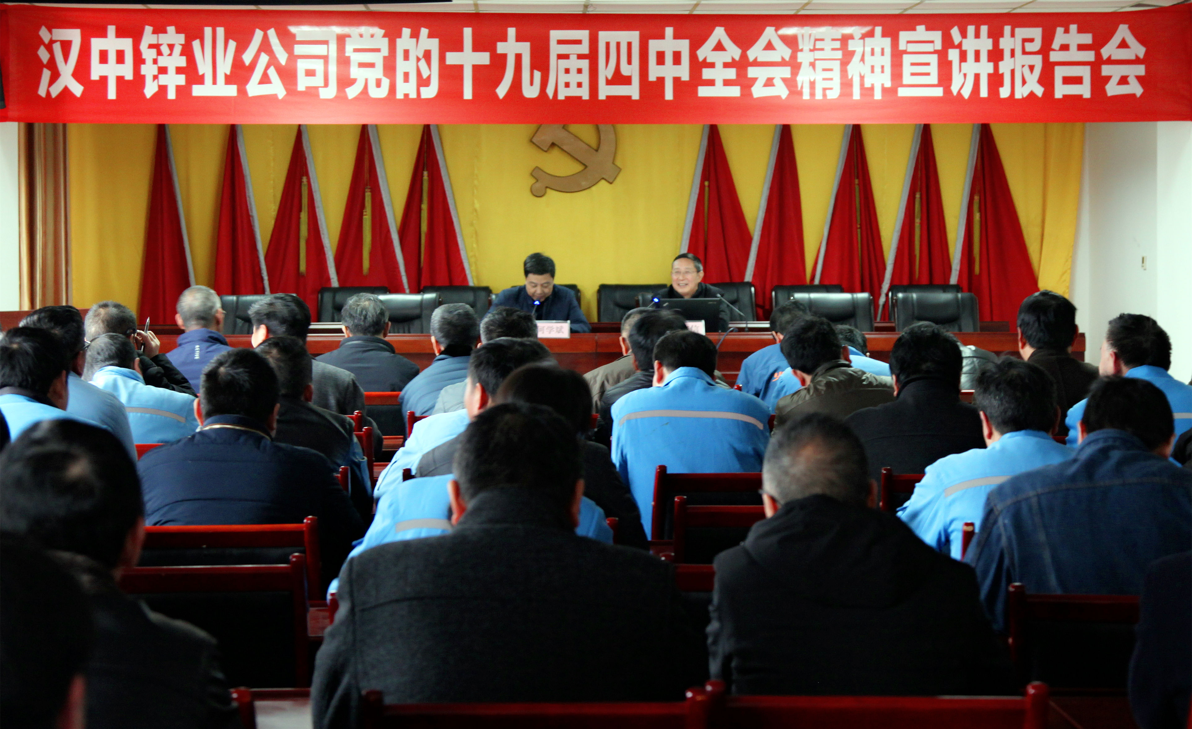 12月19日上午,集團(tuán)公司黨的十九屆四中全會(huì)宣講團(tuán)成員、陜西煎茶嶺鎳業(yè)公司黨委書(shū)記楊宏信,到漢中鋅業(yè)為廣大黨員、干部宣講黨的十九屆四中全會(huì)精神,宣講報(bào)告會(huì)由漢中鋅業(yè)公司黨委書(shū)記、董事長(zhǎng)何學(xué)斌主持。